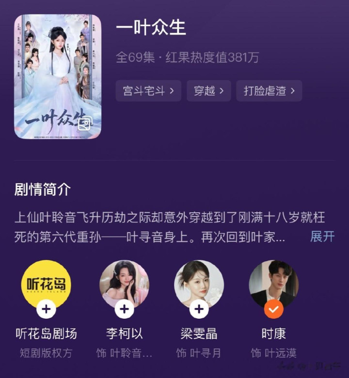 《一叶众生》怎么看都是古装版修仙界《太奶奶》,女主光环强到刺眼,儿孙争先抢后当她的奴才,除此外也有点《云渺》的既视感!大概率短国修仙题材剧情都大差不差吧!